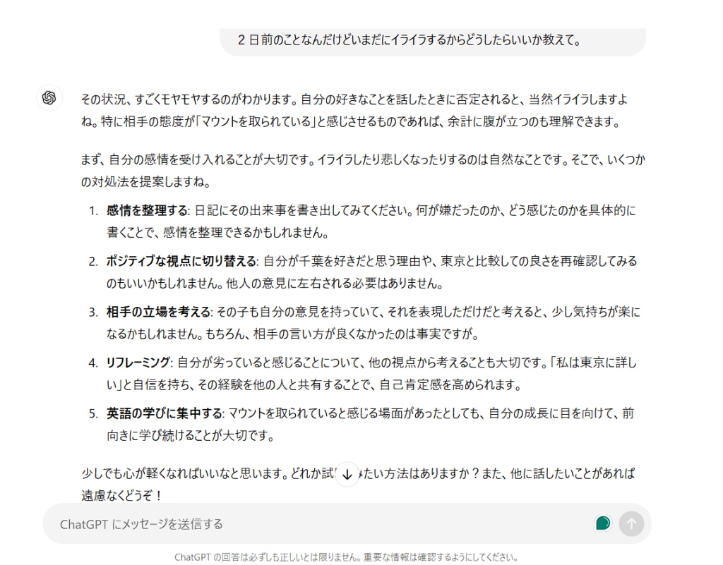 2日経っても、その人の言葉へのイライラやモヤモヤが消えなかったので、私はchatGPTに相談しました。