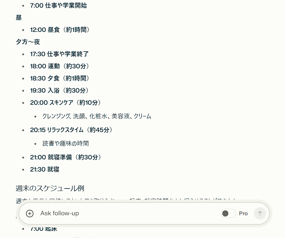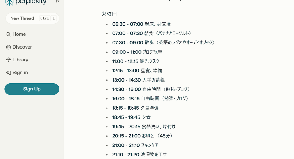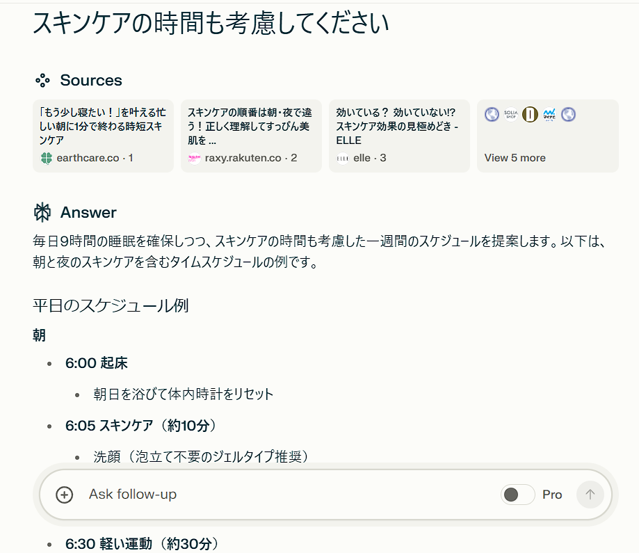 次に、Perplexityに具体的なスケジュール案を尋ねます。例えば:「毎日9時間寝るための一週間のスケジュールを教えて」