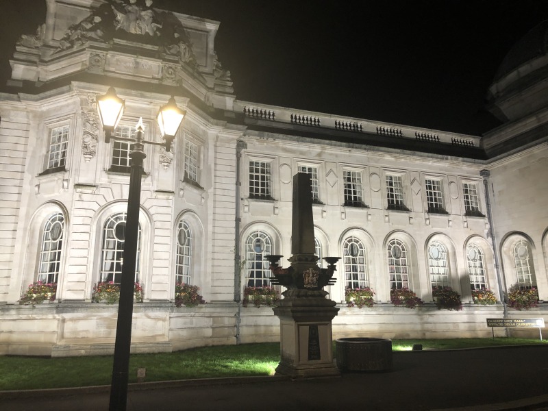 夜、ライトアップされたカーディフ国立博物館。流石にきれい