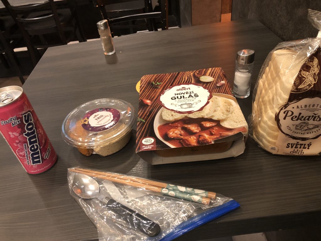 ホテルにキッチンがついてることを知らず、スープを冷たいまま飲みました。絶対温めた方が美味しいんだろうなというドロドロ感とスパイスの味を感じました。チェコ流のカレーのようにも感じました。