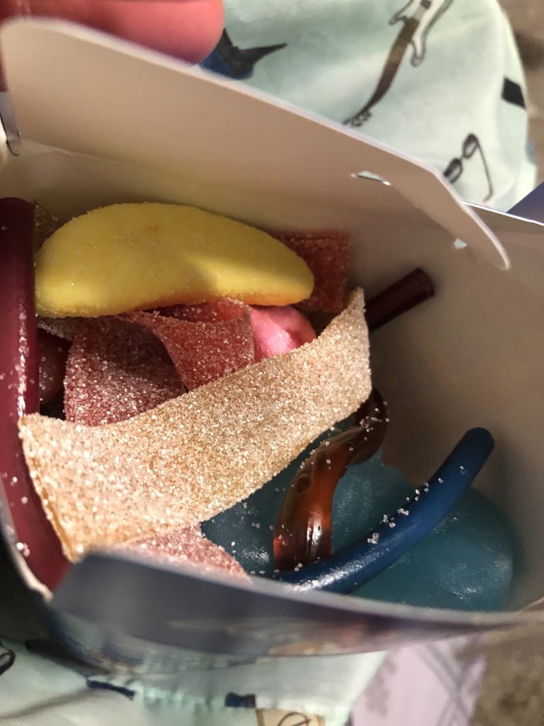 ハリボーショップでこのSサイズの箱にグミを詰められるだけ詰めてきました。