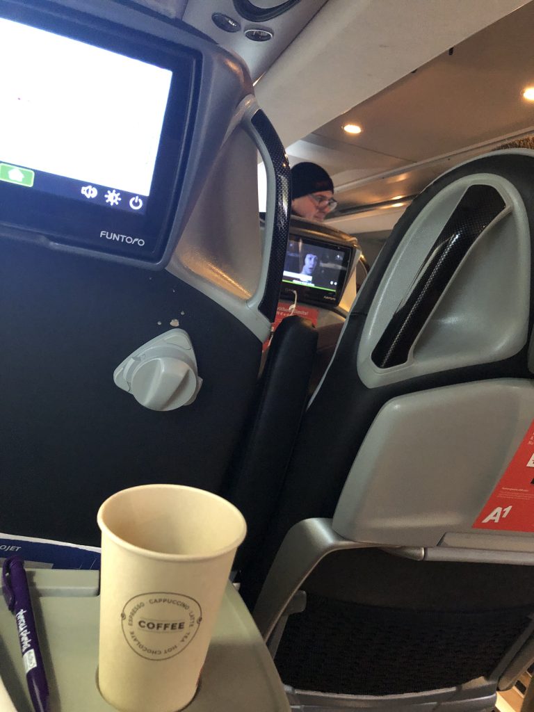 以下のように、座席にはモニターが付いており、映画や現在地を見ることができます。