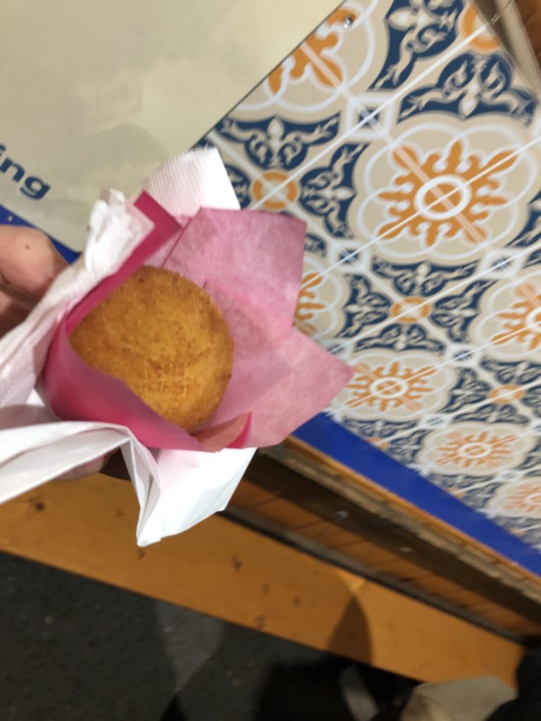 スペック(ベーコンのようなもの)とチーズを生地に包んで、カリっと揚げた料理のようで、間違いないおいしさでした。